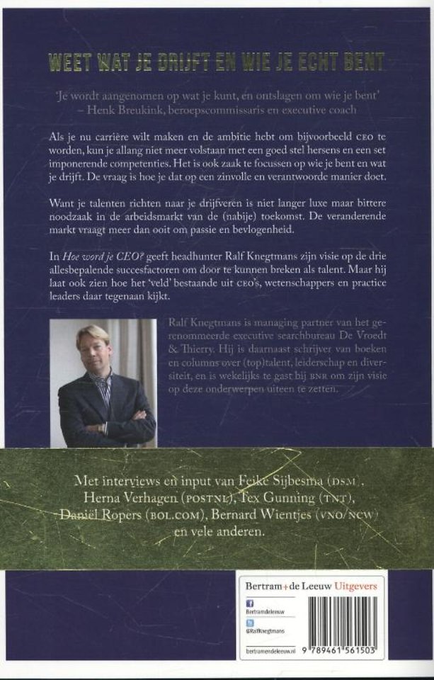 In 'Hoe word je CEO?' geeft headhunter Ralf Knegtmans zijn visie op de drie allesbepalende succesfactoren om door te kunnen breken als talent. Maar hij laat ook zien hoe het ‘veld’ bestaande uit CEO’s, wetenschappers en practice leaders daar tegenaan kijkt.