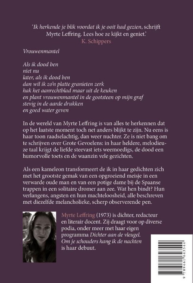 In de wereld van Myrte Leffring is van alles te herkennen dat op het laatste moment toch net anders blijkt te zijn. Nu eens is haar toon raadselachtig, dan weer nuchter. Ze is niet bang om te schrijven over Grote Gevoelens: in haar heldere, melodieuze taal krijgt de liefde steevast iets weemoedigs, de dood een humorvolle toets en de waanzin vele gezichten.