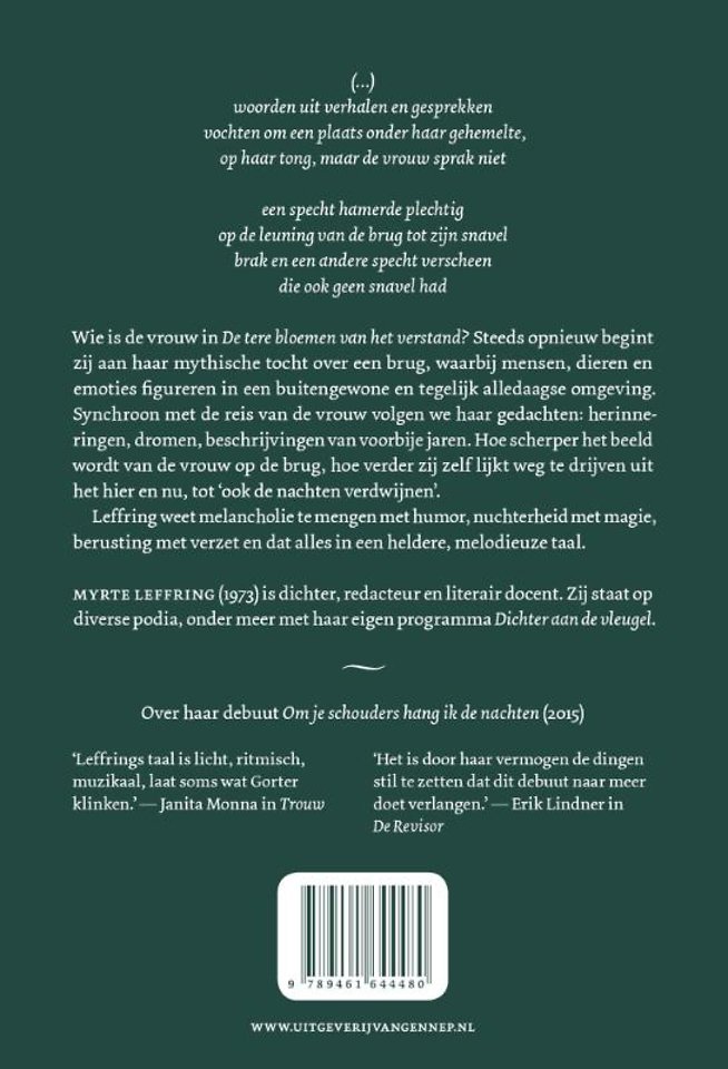 Wie is de vrouw in 'De tere bloemen van het verstand?' Steeds opnieuw begint zij aan haar mythische tocht over een brug, waarbij mensen, dieren en emoties figureren in een buitengewone en tegelijk alledaagse omgeving. Synchroon met de reis van de vrouw volgen we haar gedachten: herinneringen, dromen, beschrijvingen van voorbije jaren. Hoe scherper het beeld wordt van de vrouw op de brug, hoe verder zij zelf lijkt weg te drijven uit het hier en nu, tot 'ook de nachten verdwijnen'.