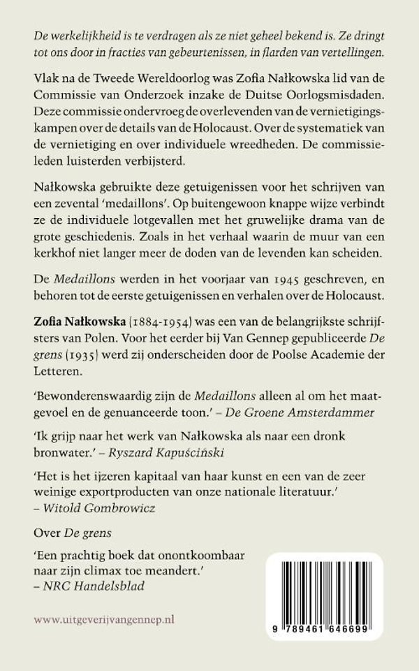 Nałkowska gebruikte deze getuigenissen voor het schrijven van een zevental 'medaillons'. Op buitengewoon knappe wijze verbindt ze de individuele lotgevallen met het gruwelijke drama van de grote geschiedenis. Zoals in het verhaal waarin de muur van een kerkhof niet langer meer de doden van de levenden kan scheiden.