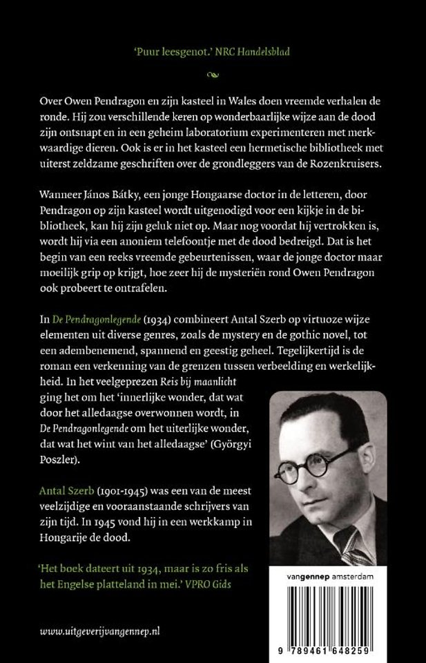 In DE PENDRAGONLEGENDE (1934) combineert Antal Szerb op virtuoze wijze elementen uit diverse genres, zoals de mystery en de gothic novel, tot een adembenemend, spannend en geestig geheel. Tegelijkertijd is de roman een verkenning van de grenzen tussen verbeelding en werkelijkheid. In het veelgeprezen REIS BIJ MAANLICHT ging het om het 'innerlijke wonder, dat wat door het alledaagse overwonnen wordt, in DE PENDRAGONLEGENDE om het uiterlijke wonder, dat wat het wint van het alledaagse' (Györgyi Poszler).