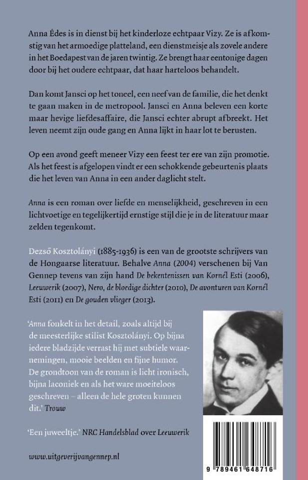 Dezső Kosztolányi (1885-1936) is een van de grootste schrijvers van de Hongaarse literatuur. Behalve ANNA (2004) verschenen bij Van Gennep tevens van zijn hand DE BEKENTENISSEN VAN KORNÉL ESTI (2006), LEEUWERIK (2007), NERO, DE BLOEDIGE DICHTER (2010), DE AVONTUREN VAN KORNÉL ESTI (2011) en DE GOUDEN VLIEGER (2013).
