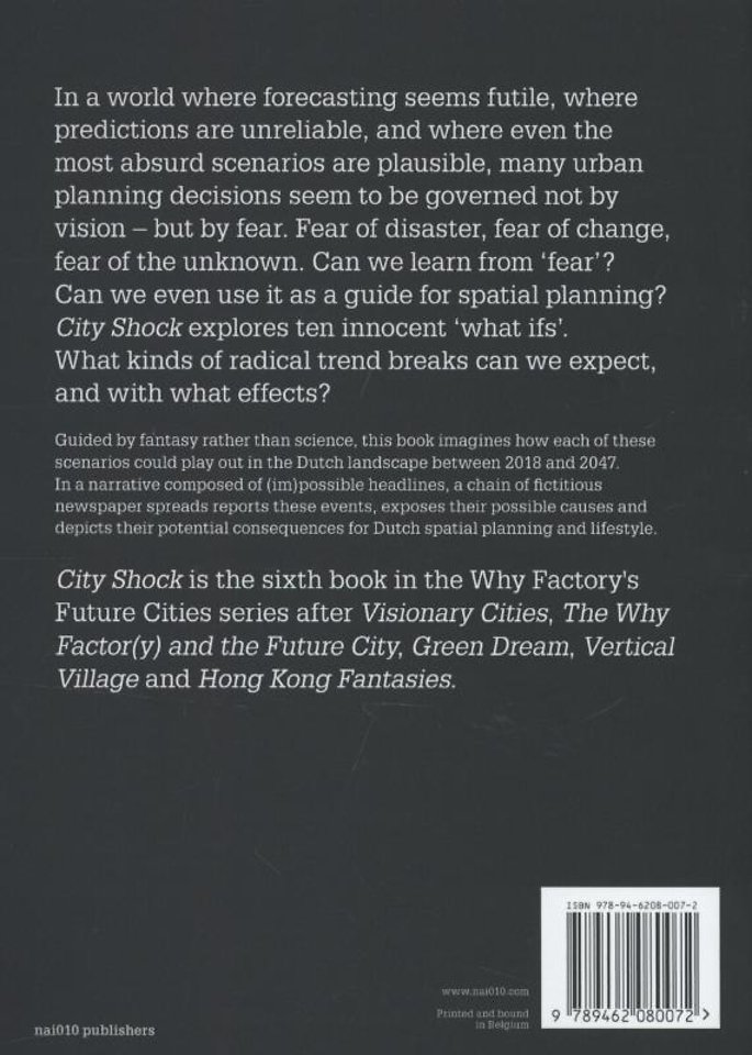 In een wereld waarin voorspellen zinloos lijkt, prognoses onbetrouwbaar en zelfs de meest absurde scenario's denkbaar zijn, lijken veel planologische beslissingen niet te worden ingegeven door visie maar door angst. Angst voor rampen, voor verandering, voor het onbekende. Kunnen we van angst leren? Kunnen we die zelfs gebruiken als leidraad voor ruimtelijke planning? In City Shock worden tien onschuldige 'wat als'-vragen gesteld. Welke radicale trendbreuken kunnen we dan verwachten, en met welke gevolgen?
