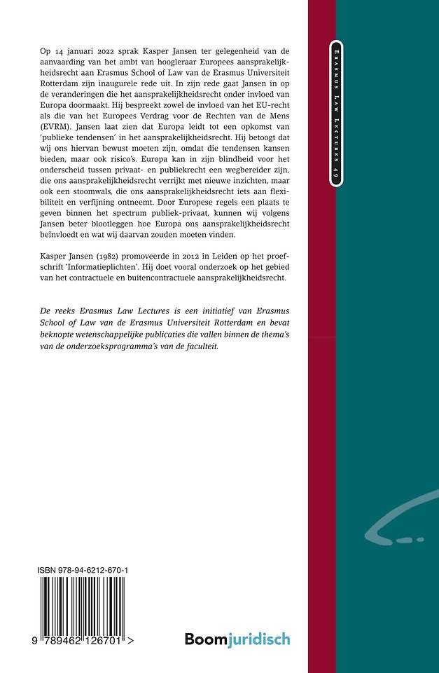 In zijn rede gaat Jansen in op de veranderingen die het aansprakelijkheidsrecht onder invloed van Europa doormaakt. Hij bespreekt zowel de invloed van het EU-recht als die van het Europees Verdrag voor de Rechten van de Mens (EVRM). Jansen laat zien dat Europa leidt tot een opkomst van ‘publieke tendensen’ in het aansprakelijkheidsrecht. Hij betoogt dat wij ons hiervan bewust moeten zijn, omdat die tendensen kansen bieden, maar ook risico’s.