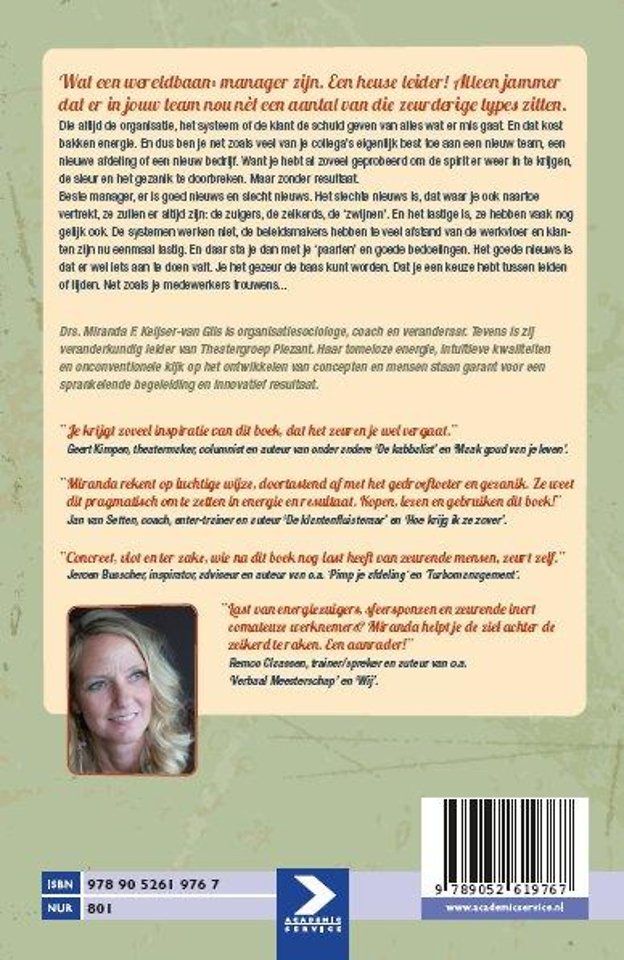 Wat een wereldbaan: manager zijn. Een heuse leider! Alleen jammer dat er in uw team nou nèt een aantal van die zeurderige types zitten. Die altijd de organisatie, het systeem of de klant de schuld geven van alles wat er mis gaat. En dat kost bakken energie. En dus bent u net zoals veel van uw collega's eigenlijk best toe aan een nieuw team, een nieuwe afdeling of een nieuw bedrijf. Want u hebt al zoveel geprobeerd om de spirit er weer in te krijgen, de sleur en het gezanik te doorbreken. Maar zonder resultaat.