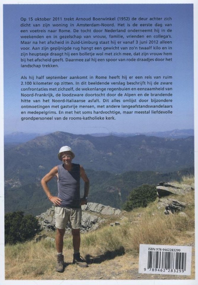 Als hij half september aankomt in Rome heeft hij er een reis van ruim 2.100 kilometer op zitten. In dit beeldende verslag beschrijft hij de zware confrontaties met zichzelf, de wekenlange regenbuien en eenzaamheid van Noord-Frankrijk, de loodzware doortocht door de Alpen en de brandende hitte van het Noord-Italiaanse asfalt. Dit alles omlijst door bijzondere ontmoetingen met gastvrije mensen, met andere langeafstands¬wandelaars en medepelgrims. En met het soms hardvochtige, maar meestal liefdevolle grondpersoneel van de rooms-katholieke kerk.