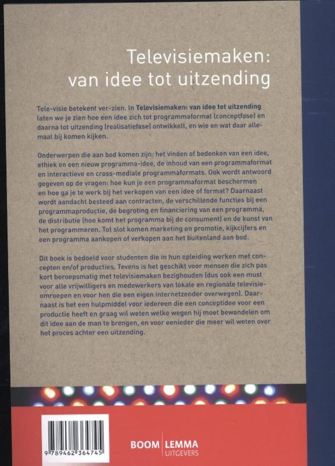 Tele-visie betekent ver-zien. In Televisiemaken: van idee tot uitzending laten we je zien hoe een idee zich tot programmaformat (conceptfase) en daarna tot uitzending (realisatiefase) ontwikkelt, en wie en wat daar allemaal bij komen kijken.
