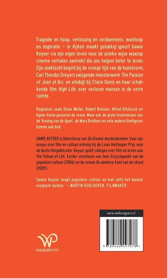 Tragedie en hoop, verlossing en verdoemenis, wanhoop en inspiratie – in 'Kijken maakt gelukkig' speurt Gawie Keyser via zijn eigen leven naar de unieke wijze waarop cinema verhalen aanreikt die ons helpen beter te leven. Zijn zoektocht begint bij de vroege tijd van de kunstvorm, Carl Theodor Dreyers zwijgende meesterwerk 'The Passion of Joan of Arc', en eindigt bij Claire Denis en haar schokkende film 'High Life', over verloren mensen in de verre ruimte.