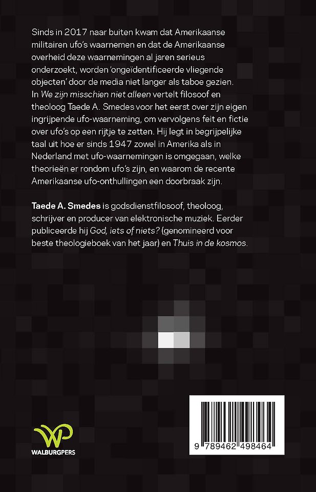 In 'We zijn misschien niet alleen' vertelt filosoof en theoloog Taede A. Smedes voor het eerst over zijn eigen ingrijpende ufo-waarneming, om vervolgens feit en fictie over ufo’s op een rijtje te zetten. Hij legt in begrijpelijke taal uit hoe er sinds 1947 zowel in Amerika als in Nederland met ufo-waarnemingen is omgegaan, welke theorieën er rondom ufo’s zijn, en waarom de recente Amerikaanse ufo-onthullingen een doorbraak zijn.