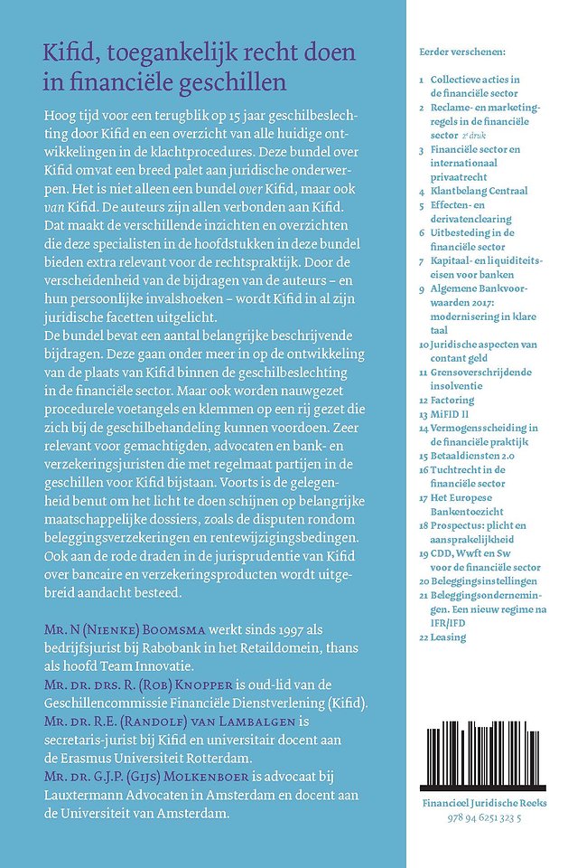 Hoog tijd voor een terugblik op 15 jaar geschilbeslechting door Kifid en een overzicht van alle huidige ontwikkelingen in de klachtprocedures. Deze bundel over Kifid omvat een breed palet aan juridische onderwerpen. Het is niet alleen een bundel over Kifid, maar ook van Kifid. De auteurs zijn allen verbonden aan Kifid. Dat maakt de verschillende inzichten en overzichten die deze specialisten in de hoofdstukken in deze bundel bieden extra relevant voor de rechtspraktijk. Door de verscheidenheid van de bijdragen van de auteurs – en hun persoonlijke invalshoeken – wordt Kifid in al zijn juridische facetten uitgelicht.