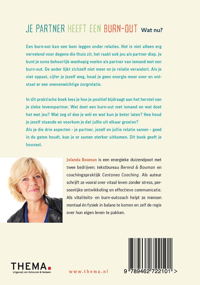 Je partner heeft een burn-out, wat nu? Het is meteen duidelijk waar dit boek over gaat. Het is het eerste boek dat ik tegenkom dat speciaal voor de partner van iemand met een burn-out geschreven is. Zeer welkom!