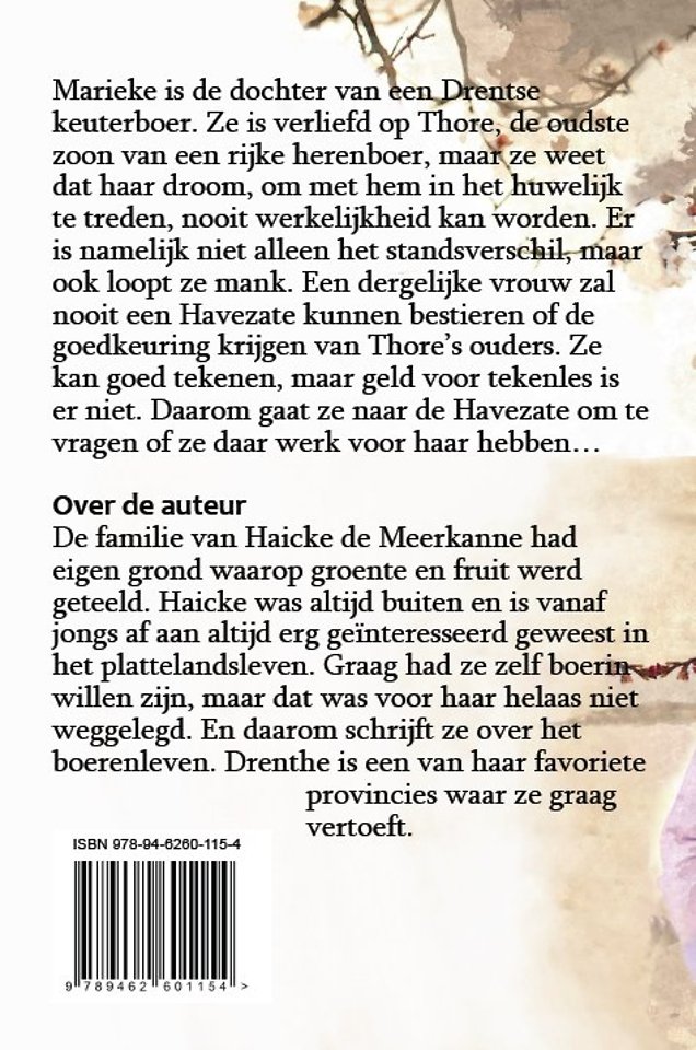 Marieke is de dochter van een Drentse keuterboer. Ze is verliefd op Thore, de oudste zoon van een rijke herenboer, maar ze weet dat haar droom, om met hem in het huwelijk te treden, nooit werkelijkheid kan worden. Er is namelijk niet alleen het standsverschil, maar ook loopt ze mank. Een dergelijke vrouw zal nooit een Havezate kunnen bestieren of de goedkeuring krijgen van Thore's ouders. Ze kan goed tekenen, maar geld voor tekenles is er niet. Daarom gaat ze naar de Havezate om te vragen of ze daar werk voor haar hebben...