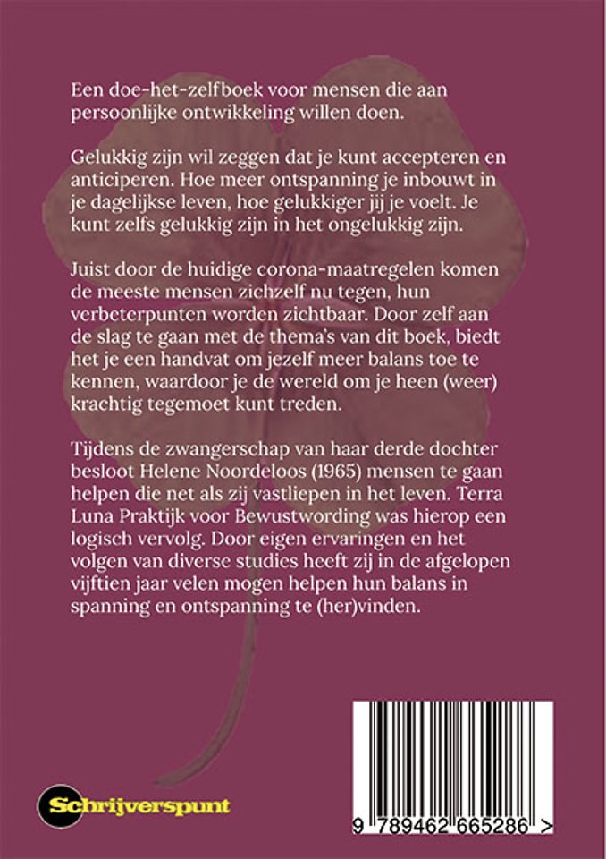 Tijdens de zwangerschap van haar derde dochter besloot Helene Noordeloos (1965) mensen te gaan helpen die net als zij vastliepen in het leven. Terra Luna Praktijk voor Bewustwording was hierop een logisch vervolg. Door eigen ervaringen en het volgen van diverse studies heeft zij in de afgelopen vijftien jaar velen mogen helpen hun balans in spanning en ontspanning te (her)vinden.