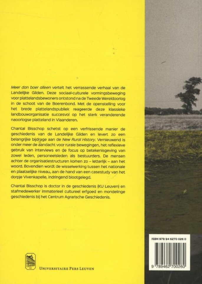 Meer dan boer alleen vertelt het verrassende verhaal van de Landelijke Gilden. Deze sociaal-culturele vormingsbeweging voor plattelandsbewoners ontstond na de Tweede Wereldoorlog in de schoot van de Boerenbond. Met de openstelling voor het brede plattelandspubliek reageerde deze klassieke landbouworganisatie succesvol op het sterk veranderende naoorlogse platteland in Vlaanderen.