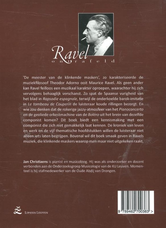 'De meester van de klinkende maskers', zo karakteriseerde de muziekfilosoof Theodor Adorno ooit Maurice Ravel. Als geen ander kan Ravel feilloos een muzikaal karakter oproepen, waarachter hij zich vervolgens behaaglijk verschanst. Zo spat de Spaanse vurigheid van het blad in Rapsodie espagnole, terwijl de onderkoelde barok-imitatie in Le tombeau de Couperin de luisteraar koude rillingen bezorgt. En wie zou denken dat de rokerige jazzy-atmosfeer van het Pianoconcerto en de geoliede orkestmachine van de Bolero uit het brein van dezelfde componist komen? Dit boek biedt een kennismaking met een componist die zich niet gemakkelijk laat kennen. De kroniek van leven en werk en de vijf thematische hoofdstukken willen de luisteraar niet alleen iets laten begrijpen. Bovenal wil dit boek smaak geven in Ravels muziek, die klinkende maskers waarop men maar niet uitgekeken raakt.
