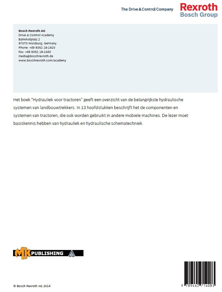 Het boek “Hydrauliek voor tractoren” geeft een overzicht van de belangrijkste hydraulische systemen van landbouwtrekkers. In 13 hoofdstukken beschrijft het de componenten en systemen van tractoren, die ook worden gebruikt in andere mobiele machines. De lezer moet basiskennis hebben van hydrauliek en hydraulische schematechniek.