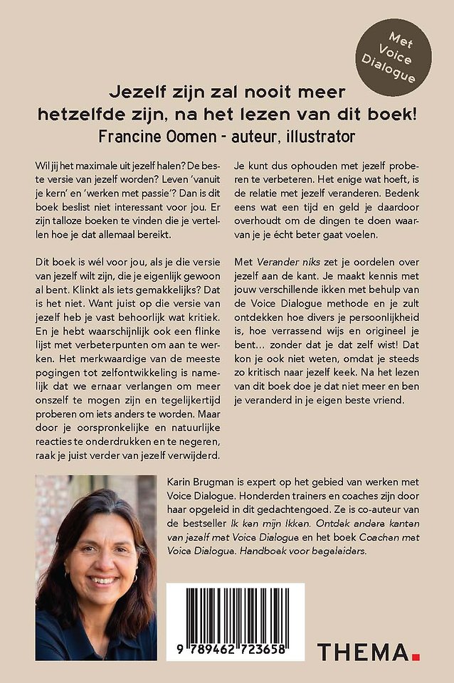 Met Verander niks zet je oordelen over jezelf aan de kant. Je maakt kennis met jouw verschillende ikken door de methode Voice Dialogue en je zult ontdekken hoe divers je persoonlijkheid is, hoe verrassend wijs en origineel je bent … zonder dat je dat zelf wist! Dat kon je ook niet weten, omdat je steeds zo kritisch naar jezelf keek. Na het lezen van dit boek doe je dat niet meer en ben je veranderd in je eigen beste vriend.