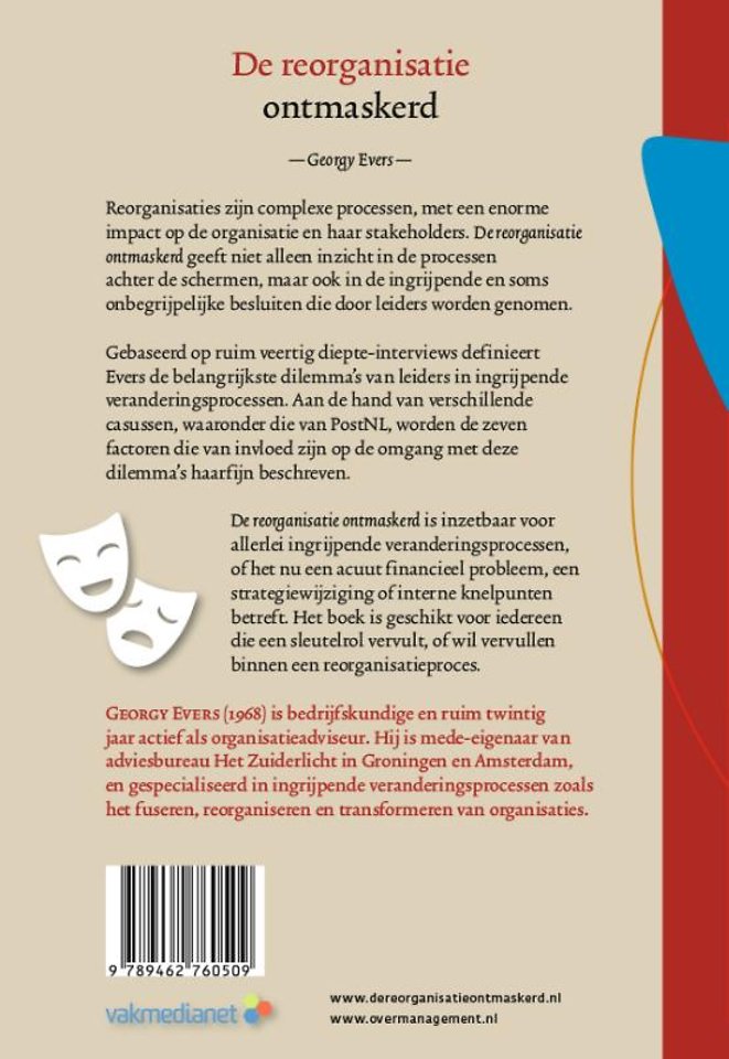 Meer over Georgy EversReorganisaties zijn complexe processen, met een enorme impact op de organisatie en haar stakeholders. 'De reorganisatie ontmaskerd' geeft niet alleen inzicht in de processen achter de schermen, maar ook in de ingrijpende en soms onbegrijpelijke besluiten die door leiders worden genomen. Gebaseerd op ruim veertig diepte-interviews definieert Evers de belangrijkste dilemma’s van leiders in ingrijpende veranderingsprocessen. Aan de hand van verschillende casussen, waaronder die van PostNL, worden de zeven factoren die van invloed zijn op de omgang met deze dilemma’s haarfijn beschreven.