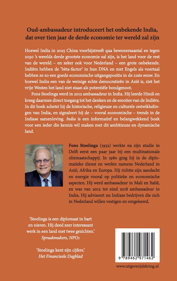 Fons Stoelinga werd in 2012 ambassadeur in India. Hij leerde Hindi en kreeg daarmee direct toegang tot het denken en de emoties van de Indiërs. In dit boek schetst hij de historische, religieuze en culturele ontwikkelingen van India, en signaleert hij de - vooral economische - trends in de Indiase samenleving. INDIA is een informatief en belangwekkend boek voor een ieder die kennis wil maken met dit ambitieuze en dynamische land.