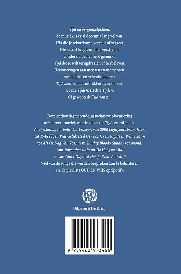 Deze enthousiasmerende, associatieve bloemlezing memoreert muziek waarin de factor Tijd een rol speelt. Van YESTERDAY tot FOTO VAN VROEGER, van NIGHTS IN WHITE SATIN tot ALS DE DAG VAN TOEN en van GLORY DAYS tot HEB JE EVEN VOOR MIJ? Veel van de songs die in dit boek besproken worden, zijn te beluisteren via de playlists "De Kring OUD EN WIJS" op Spotify.