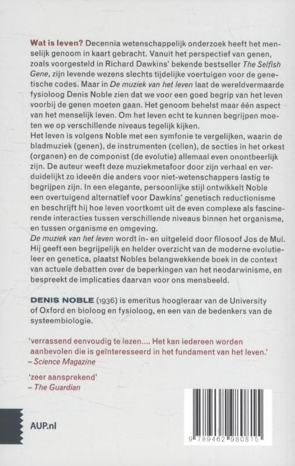 Wat is leven? Decennia wetenschappelijk onderzoek heeft het menselijk genoom in kaart gebracht. Vanuit het perspectief van genen, zoals voorgesteld in Richard Dawkins bekende bestseller The Selfish Gene, zijn levende wezens slechts tijdelijke voertuigen voor de genetische codes. Maar in De muziek van het leven laat de wereldvermaarde fysioloog Denis Noble zien dat we voor een goed begrip van het leven voorbij de genen moeten gaan. Het genoom behelst maar één aspect van het menselijk leven. Om het leven echt te kunnen begrijpen moeten we op verschillende niveaus tegelijk kijken.