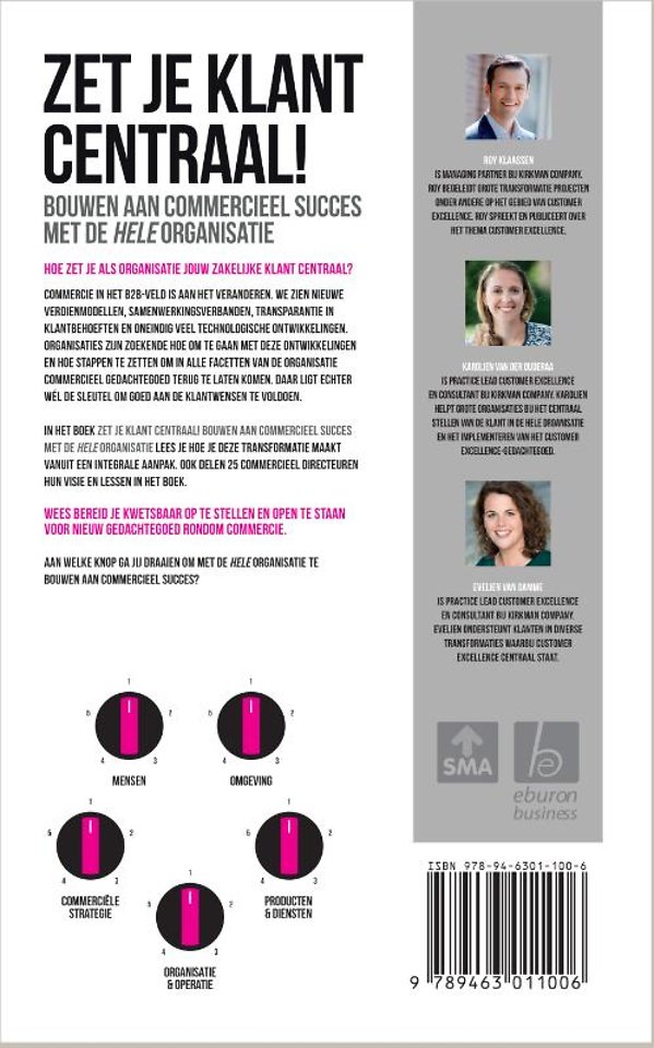 In het boek 'Zet je klant centraal! Bouwen aan commercieel succes met de hele organisatie' lees je hoe je deze transformatie maakt vanuit een integrale aanpak. Ook delen 25 commercieel directeuren hun visie en lessen in het boek. Aan het woord komen directeuren van onder meer Achmea, Yacht, ASR, Transavia, Boskalis en Salesforce. Wees bereid je kwetsbaar op te stellen en open te staan voor nieuw gedachtegoed rondom commercie. Aan welke knop ga jij draaien om met de hele organisatie te bouwen aan commercieel succes.
