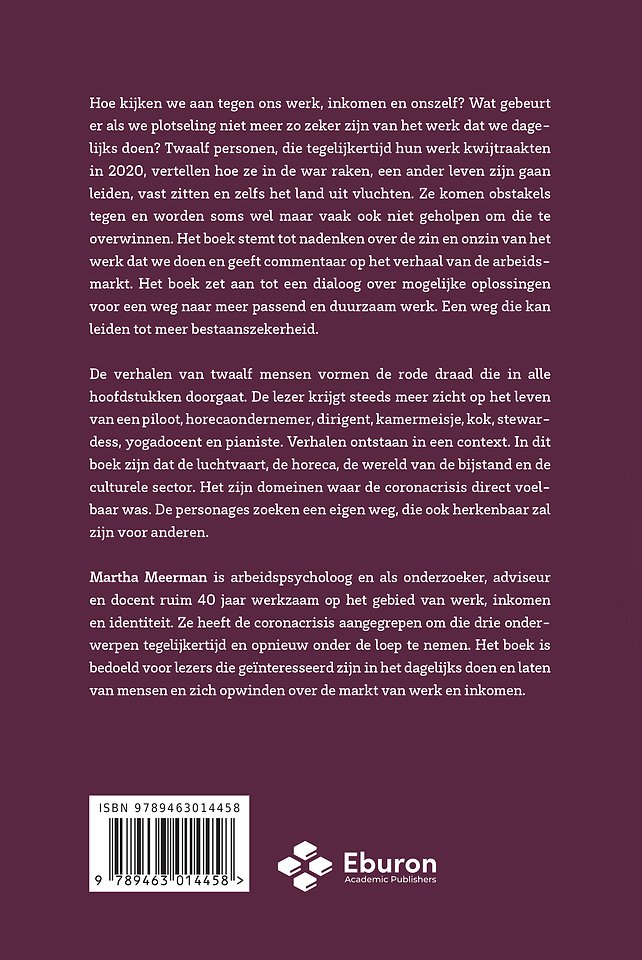 Martha Meerman is arbeidspsycholoog en als onderzoeker, adviseur en trainer ruim 40 jaar werkzaam op het gebied van werk, inkomen en identiteit. Ze heeft de coronacrisis aangegrepen om die drie onderwerpen tegelijkertijd en opnieuw onder de loep te nemen. Het boek is bedoeld voor lezers die geïnteresseerd zijn in het dagelijks doen en laten van mensen en zich opwinden over de markt van werk en inkomen. Eerder verscheen van haar hand Studiesucces en diversiteit, en wat HBO-docenten daarmee te maken hebben (samen met Daniel van Middelkoop, 2014) het boek Mens en markt: HRM-onderzoek op het HBO (2019).