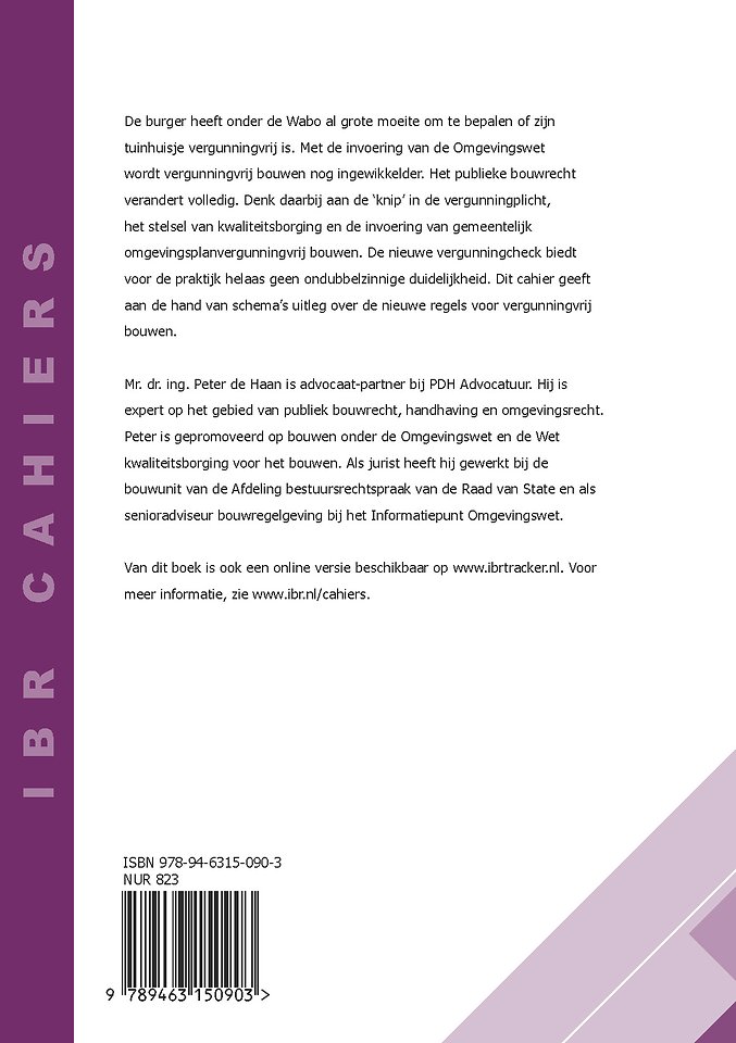 De burger heeft onder de Wabo al grote moeite om te bepalen of zijn tuinhuisje vergunningvrij is. Met de invoering van de Omgevingswet wordt vergunningvrij bouwen nog ingewikkelder. Het publieke bouwrecht verandert volledig. Denk daarbij aan de ‘knip’ in de vergunningplicht, het stelsel van kwaliteitsborging en de invoering van gemeentelijk omgevingsplanvergunningvrij bouwen. De nieuwe vergunningcheck biedt voor de praktijk helaas geen ondubbelzinnige duidelijkheid. Dit cahier geeft aan de hand van schema’s uitleg over de nieuwe regels voor vergunningvrij bouwen.