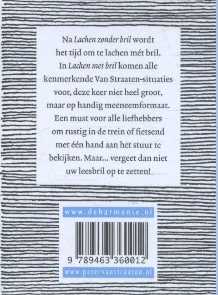 Vijf jaar na Lachen zonder bril, wordt het tijd om te lachen mét bril. In Lachen met bril komen alle kenmerkende Van Straaten situaties voor, deze keer niet heel groot, maar op handig meeneemformaat. En straks tijdens de feestdagen ideaal voor in de schoen of klomp. Een must voor alle liefhebbers om rustig in de trein of fietsend met één hand te bekijken. Maar: vergeet niet uw bril op te zetten!