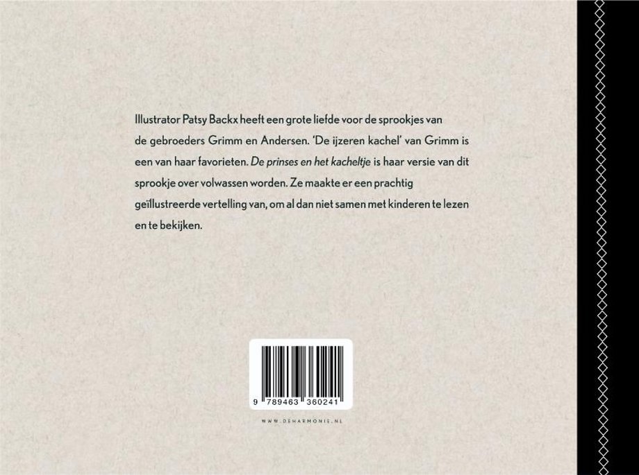Patsy Backx, vooral bekend als illustrator van andermans kinderboeken (waaronder enkele van Karel Eykman), heeft een grote liefde voor de sprookjes van de gebroeders Grimm en Andersen. 'De ijzeren kachel' van Grimm is een van haar favorieten. Niet gek dus dat zij nu met De prinses en het kacheltje tekent voor haar interpretatie van dit sprookje over volwassen worden. Universele thema's als nieuwsgierigheid, vertrouwen, vriendschap, ouderliefde, liefde en jaloezie passeren de revue. Maar bovenal is het gewoon een prachtig geïllustreerd verhaal om al dan niet samen met kinderen te lezen en te bekijken.