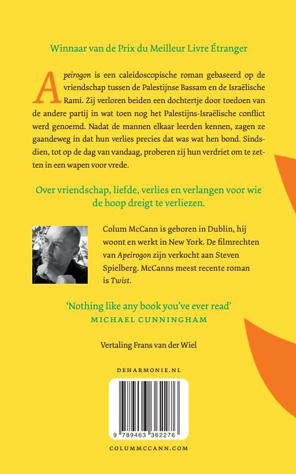 Apeirogon is een caleidoscopische roman gebaseerd op de vriendschap tussen de Palestijnse Bassam en de Israëlische Rami. Zij verloren beiden een dochtertje door toedoen van de andere partij in wat toen nog het Palestijns-Israëlische conflict