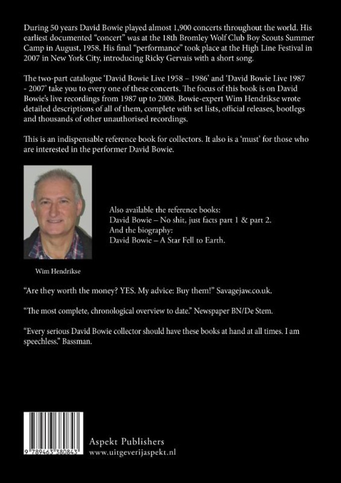 The two-part catalogue 'David Bowie Live 1958 - 1986' and 'David Bowie Live 1987 - 2007' take you to every one of these concerts. The focus of this book is on David Bowie's live recordings from 1987 up to 2008. Bowie-expert Wim Hendrikse wrote detailed descriptions of all of them, complete with set lists, official releases, bootlegs and thousands of other unauthorised recordings.