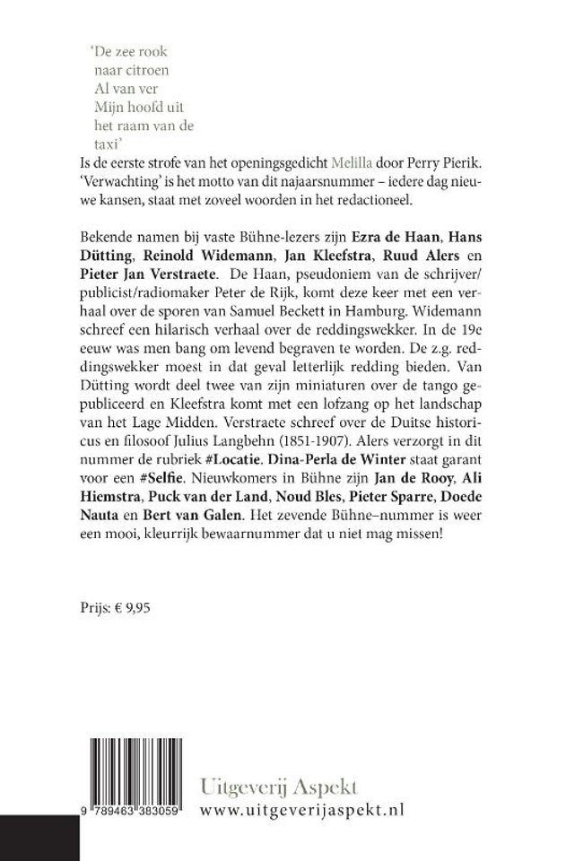 Bekende namen bij vaste Bühne-lezers zijn Ezra de Haan, Hans Dütting, Reinold Widemann, Jan Kleefstra, Ruud Alers en Pieter Jan Verstraete. De Haan, pseudoniem van de schrijver/publicist/radiomaker Peter de Rijk, komt deze keer met een verhaal over de sporen van Samuel Beckett in Hamburg. Widemann schreef een hilarisch verhaal over de reddingswekker. In de 19e eeuw was men bang om levend begraven te worden. De z.g. reddingswekker moest in dat geval letterlijk redding bieden. Van Dütting wordt deel twee van zijn miniaturen over de tango gepubliceerd en Kleefstra komt met een lofzang op het landschap van het Lage Midden. Verstraete schreef over de Duitse historicus en filosoof Julius Langbehn (1851-1907). Alers verzorgt in dit nummer de rubriek #Locatie. Dina-Perla de Winter staat garant voor een #Selfie. Nieuwkomers in Bühne zijn Jan de Rooy, Ali Hiemstra, Puck van der Land, Noud Bles, Pieter Sparre, Doede Nauta en Bert van Galen. Het zevende Bühne-nummer is weer een mooi, kleurrijk bewaarnummer dat u niet mag missen!