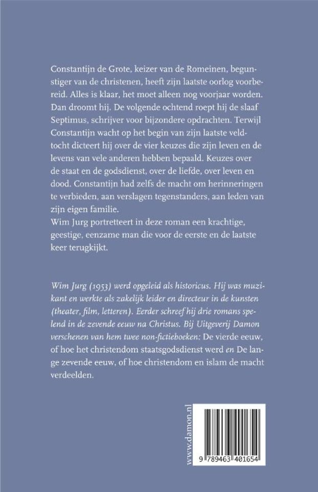 Wim Jurg portretteert in deze eerste historische roman over Constantijn een krachtige, geestige, eenzame man die voor de eerste en de laatste keer terugkijkt.