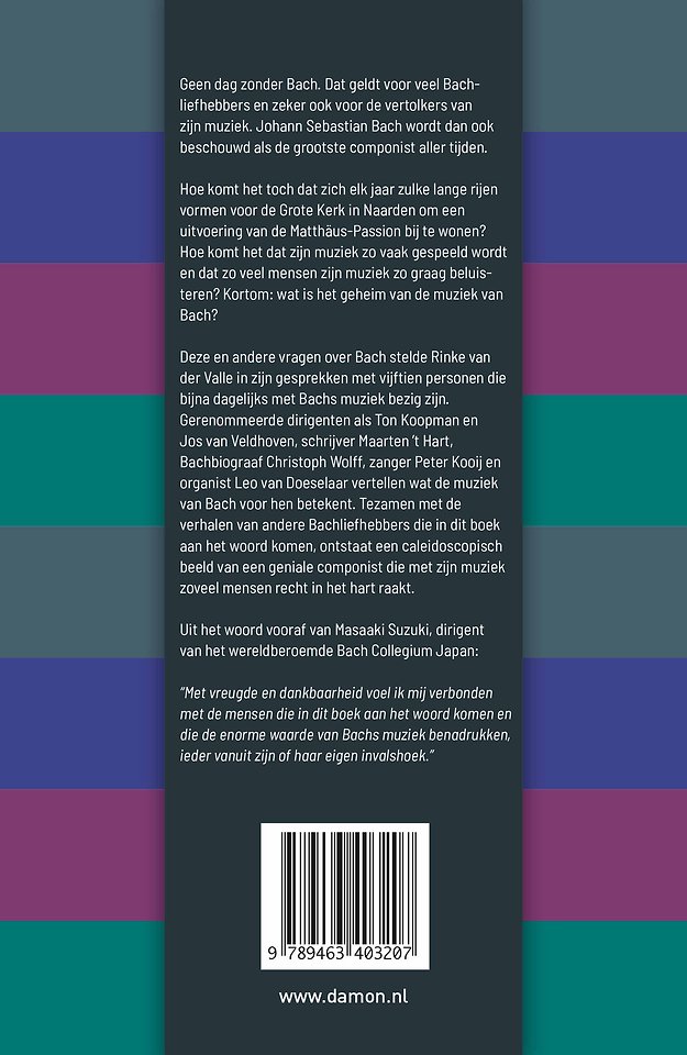 Deze en andere vragen over Bach stelde Rinke van der Valle in zijn gesprekken met vijftien personen die bijna dagelijks met Bachs muziek bezig zijn. Gerenommeerde dirigenten als Ton Koopman en Jos van Veldhoven, schrijver Maarten ’t Hart, Bachbiograaf Christoph Wolff, zanger Peter Kooij en organist Leo van Doeselaar vertellen wat de muziek van Bach voor hen betekent. Tezamen met de verhalen van andere Bachliefhebbers die in dit boek aan het woord komen, ontstaat een caleidoscopisch beeld van een geniale componist die met zijn muziek zoveel mensen recht in het hart raakt.