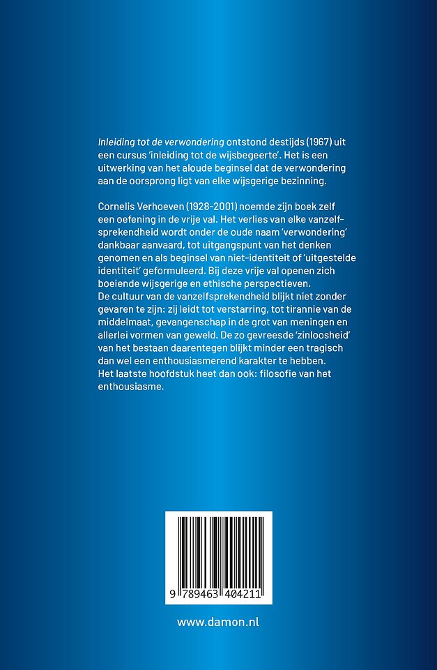 In 'Inleiding tot de verwondering' werkt Cornelis Verhoeven het aloude idee uit dat filosoferen begint met het toelaten van verwondering en het loslaten van vanzelfsprekendheid. Verwondering is iets dat je overkomt en gaat aan het vragen en het denken vooraf. Ze wordt het startpunt van een ontdekkingstocht waarin Verhoeven je stap voor stap tot filosoferen brengt. Deze Inleiding tot de verwondering zou dus ook een praktische ‘inleiding in de filosofie’ kunnen heten.
