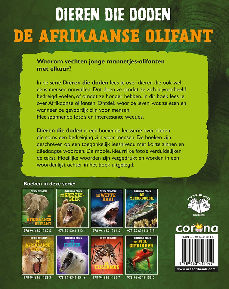 In de serie Dieren die doden lees je over dieren die ook wel eens mensen aanvallen. Dat doen ze omdat ze zich bijvoorbeeld bedreigd voelen, of omdat ze honger hebben. In dit boek lees je over Afrikaanse olifanten. Ontdek waar ze leven, wat ze eten en wanneer ze gevaarlijk zijn voor mensen. Met spannende foto’s en interessante weetjes.