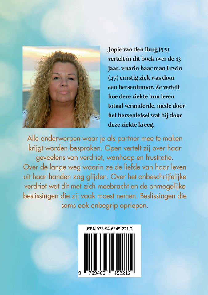 Jopie van den Burg ( 1962) vertelt in dit boek over de 13 jaar, waarin haar man Erwin ( 1969) ernstig ziek was door een hersentumor. Ze vertelt hoe deze ziekte hun leven totaal veranderde, mede door het hersenletsel wat hij door deze ziekte kreeg.