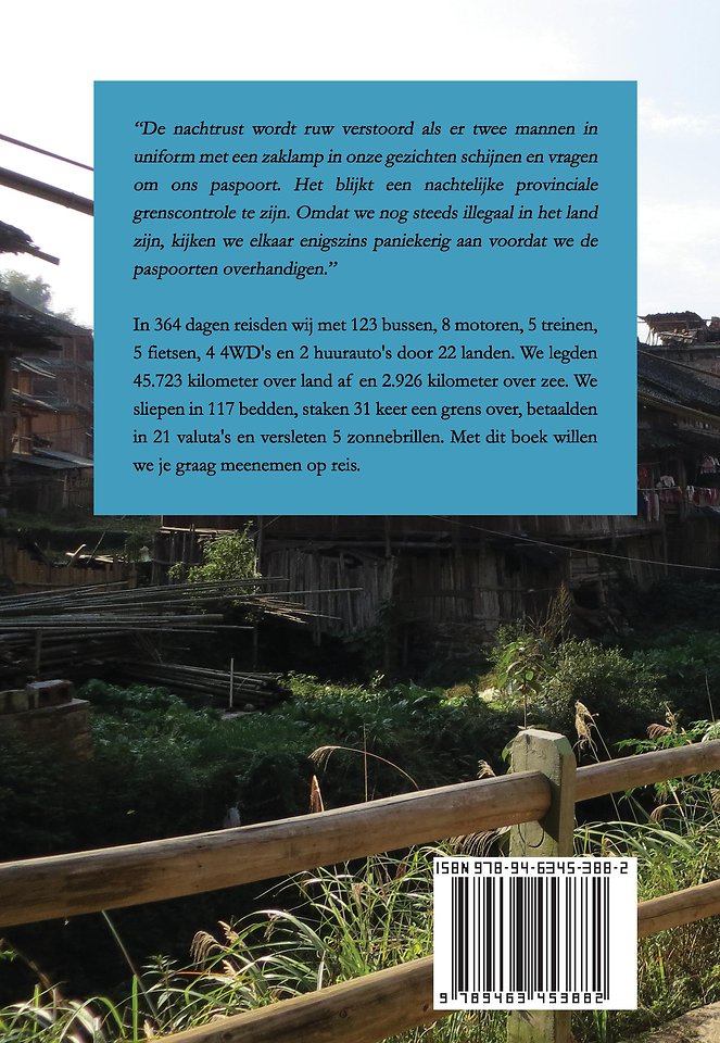 In 364 dagen reisden wij met 123 bussen, 8 motoren, 5 treinen, 5 fietsen, 4 4WD's en 2 huurauto's door 22 landen. We legden 45.723 kilometer over land af en 2.926 kilometer over zee. We sliepen in 117 bedden, staken 31 keer een grens over, betaalden in 21 valuta's en versleten 5 zonnebrillen. Met dit boek willen we je graag meenemen op reis.
