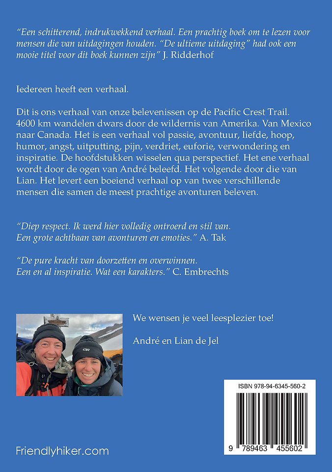 Dit is ons verhaal van onze belevenissen op de Pacifi c Crest Trail. 4600 km wandelen dwars door de wildernis van Amerika. Van Mexico naar Canada. Het is een verhaal vol passie, avontuur, liefde, hoop, humor, angst, uitputt ing, pijn, verdriet, euforie, verwondering en inspiratie. De hoofdstukken wisselen qua perspectief. Het ene verhaal wordt door de ogen van André beleefd. Het volgende door die van Lian. Het levert een boeiend verhaal op van twee verschillende mensen die samen de meest prachtige avonturen beleven.
