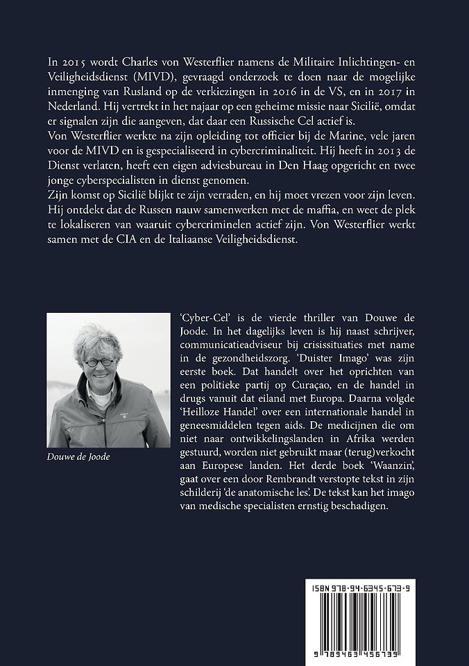 ‘Cyber-Cel’ is de vierde thriller van Douwe de Joode. In het dagelijks leven is hij naast schrijver, communicatieadviseur bij crisissituaties met name in de gezondheidszorg. ‘Duister Imago’ was zijn eerste boek. Dat handelt over het oprichten van een politieke partij op Curaçao, en de handel in drugs vanuit dat eiland met Europa. Daarna volgde ‘Heilloze Handel’ over een internationale handel in geneesmiddelen tegen aids. De medicijnen die om niet naar ontwikkelingslanden in Afrika werden gestuurd, worden niet gebruikt maar (terug)verkocht aan Europese landen. Het derde boek ‘Waanzin’, gaat over een door Rembrandt verstopte tekst in zijn schilderij ‘de anatomische les’. De tekst kan het imago van medische specialisten ernstig beschadigen.