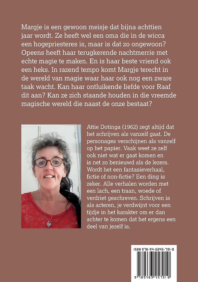 Margje is een gewoon meisje dat bijna achttien jaar wordt. Ze heeft wel een oma die in de wicca een hogepriesteres is, maar is dat zo ongewoon? Opeens heeft haar terugkerende nachtmerrie met echte magie te maken. En is haar beste vriend ook een heks. In razend tempo komt Margje terecht in de wereld van magie waar haar ook nog een zware taak wacht. Kan haar ontluikende liefde voor Raaf dit aan? Kan ze zich staande houden in die vreemde magische wereld die naast de onze bestaat?