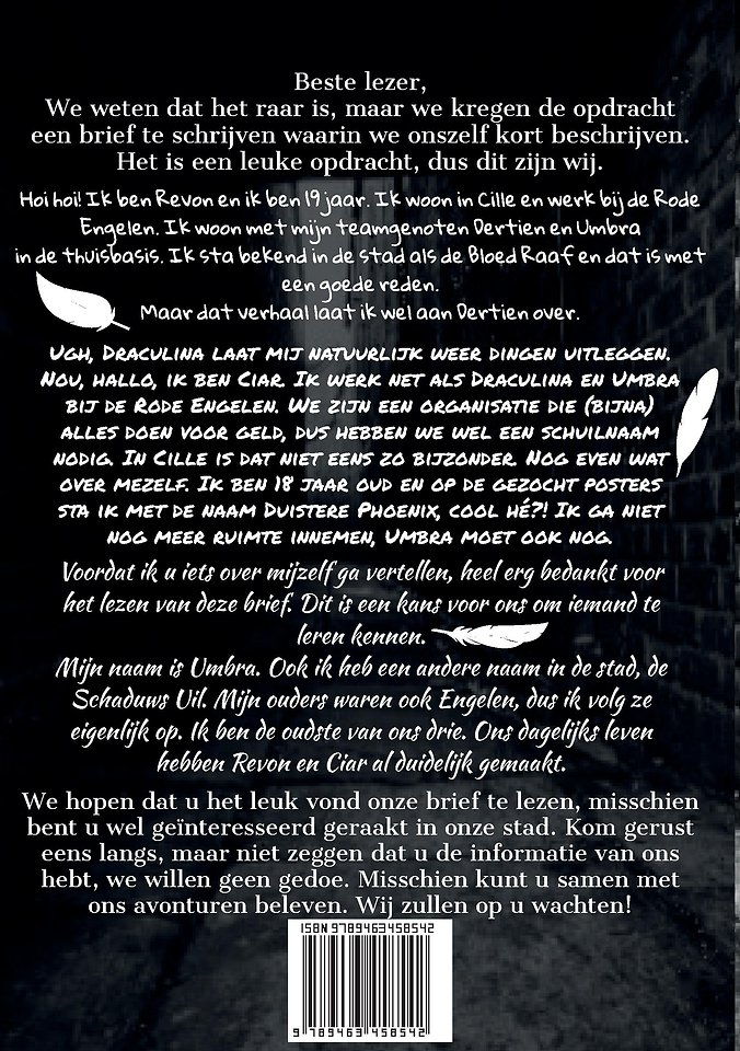 Ugh, Draculina laat mij natuurlijk weer dingen uitleggen. Nou, hallo, ik ben Ciar. Ik werk net als Draculina en Umbra bij de Rode Engelen. We zijn een organisatie die (bijna) alles doen voor geld, dus hebben we wel een schuilnaam nodig. In Cille is dat niet eens zo bijzonder. Nog even wat over mezelf. Ik ben 18 jaar oud en op de gezocht posters sta ik met de naam Duistere Phoenix, cool hé?! Ik ga niet nog meer ruimte innemen, Umbra moet ook nog.