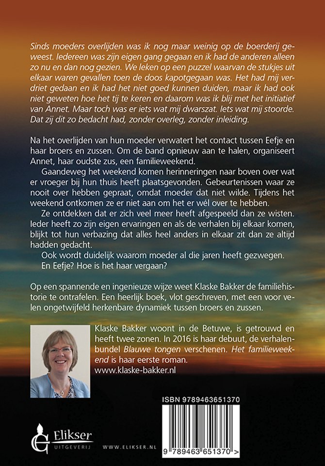 Klaske Bakker woont in de Betuwe, is getrouwd en heeft twee zonen. In 2016 is haar debuut, de verhalenbundel Blauwe tongen verschenen. Het familieweekend is haar eerste roman.