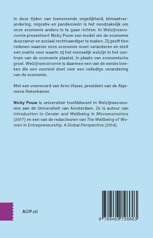 In deze tijden van toenemende ongelijkheid, klimaatverandering, migratie en pandemieën is het noodzakelijk om onze economie anders in te gaan richten. In 'Welzijnseconomie' presenteert Nicky Pouw een model om de economie duurzamer en sociaal rechtvaardiger te maken. Zij geeft tien redenen waarom onze economie moet veranderen en stelt een matrix voor waarin zij het menselijk welzijn in het centrum van de economie plaatst, in plaats van economische groei.