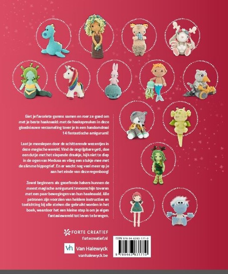 Pak je haaknaald en schuif je favoriete stoel erbij: met de patronen in deze gloednieuwe verzameling tover je in een handomdraai 14 fantastische amigurumi uit je haaknaald! Laat je meeslepen door de schitterende wezentjes in deze magische wereld. Vind de ongrijpbare yeti, doe een dutje met het slapende draakje, kijk niet te diep in de ogen van Medusa en wees op je hoede voor de slimme hippogrief. En er wacht nog meer op je aan het einde van deze regenboog!