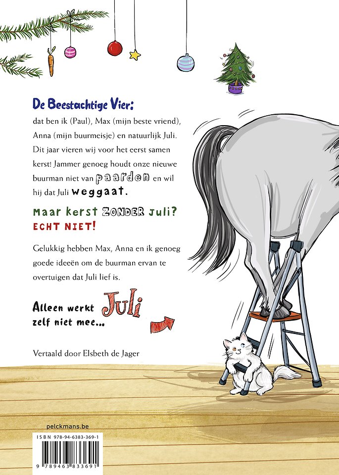 De Beestachtige Vier: dat ben ik (Paul), Max (mijn beste vriend), Anna (mijn buurmeisje) en natuurlijk Juli. Dit jaar vieren wij voor het eerst samen kerst! Jammer genoeg houdt onze nieuwe buurman niet van paarden en wil hij dat Juli weggaat. Maar kerst zonder Juli? Echt niet! Gelukkig hebben Max, Anna en ik genoeg goede ideeën om de buurman ervan te overtuigen dat Juli lief is. Alleen werkt Juli zelf niet mee…