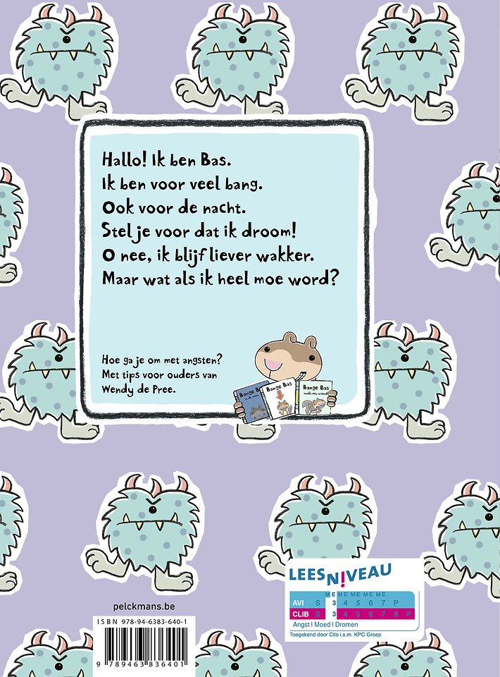 Bange Bas slaapt nooit – slaap betekent misschien nare dromen over draken, spoken, vampiervleermuizen en gestipte monsters. Onze breedogige held heeft een plan: de hele nacht wakker blijven, elke nacht. Maar als de uitputting zijn tol eist, lijken al de angsten van Bange Bas in een droom uit te komen. Lukt het Bange Bas een oplossing te vinden om lekker lang te slapen?
