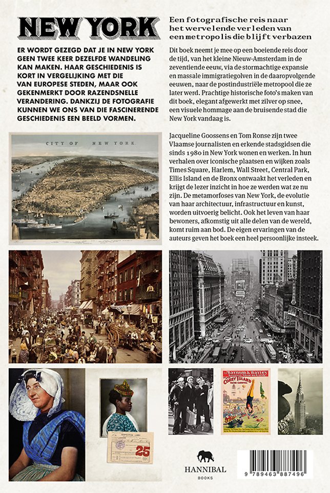 Een fotografische reis naar het wervelende verleden van een metropolis die blijft verbazenEr wordt gezegd dat je in New York geen twee keer dezelfde wandeling kan maken. Haar geschiedenis is kort in vergelijking met die van Europese steden, maar ook gekenmerkt door razendsnelle verandering. Dankzij de fotografie kunnen we ons van die fascinerende geschiedenis een beeld vormen.Dit boek neemt je mee op een boeiende reis door de tijd, van het kleine Nieuw-Amsterdam in de zeventiende eeuw, via de stormachtige expansie en massale immigratiegolven in de daaropvolgende eeuwen, naar de postindustriële metropool die ze later werd. Prachtige historische foto’s maken van dit boek, elegant afgewerkt met zilver op snee, een visuele hommage aan de bruisende stad die New York vandaag is.Jacqueline Goossens en Tom Ronse zijn twee Vlaamse journalisten en erkende stadsgidsen die sinds 1980 in New York wonen en werken. In hun verhalen over iconische plaatsen en wijken zoals Times Square, Harlem, Wall Street, Central Park, Ellis Island en de Bronx ontwaakt het verleden en krijgt de lezer inzicht in hoe ze werden wat ze nu zijn. De metamorfoses van New York, de evolutie van haar architectuur, infrastructuur en kunst, worden uitvoerig belicht. Ook het leven van haar bewoners, afkomstig uit alle delen van de wereld, komt ruim aan bod. De eigen ervaringen van de auteurs geven het boek een heel persoonlijke insteek.