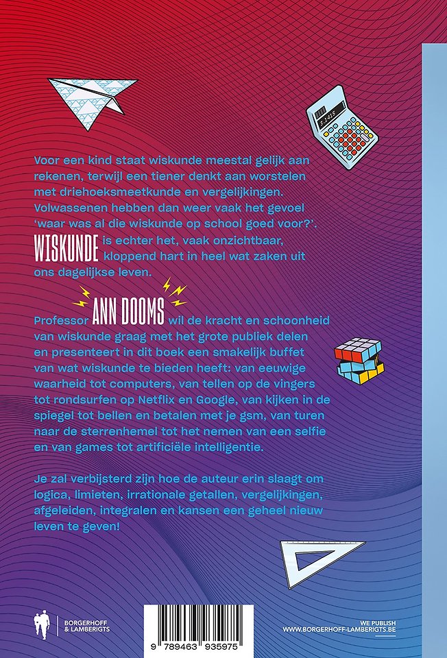 Wiskunde is echter het, vaak onzichtbaar, kloppend hart in heel wat zaken uit ons dagelijkse leven. Professor Ann Dooms wil de kracht en schoonheid van wiskunde graag met het grote publiek delen en presenteert in dit boek een smakelijk buffet van wat wiskunde te bieden heeft: van eeuwige waarheid tot computers, van tellen op de vingers tot rondsurfen op Netflix en Google, van kijken in de spiegel tot bellen en betalen met je gsm, van turen naar de sterrenhemel tot het nemen van een selfie en van games tot artificiële intelligentie.